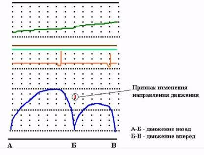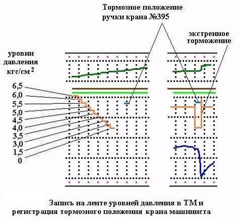В процессе движения, если давление в ТМ не изменяется, то на ленте будет прямая горизонтальная линия. Если машинист производит торможение поезда, то на ленте это будет отмечено зигзагообразной линией, по виду которой можно судить о режиме торможения. Так, например, на рис. показано экстренное торможение краном машиниста с разрядкой ТМ до 0.
