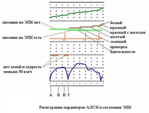 Регистрация параметров АЛСН и состояния ЭПК показано на рисунке. При наличии на локомотивном светофоре какого-либо огня (зеленого, желтого, желтого с красным, красного или белого) на ленте в соответствующей позиции печатаются точки, образуя непрерывные прямые линии. При отсутствии огней на локомотивном светофоре печать точек в этих позициях не производится.