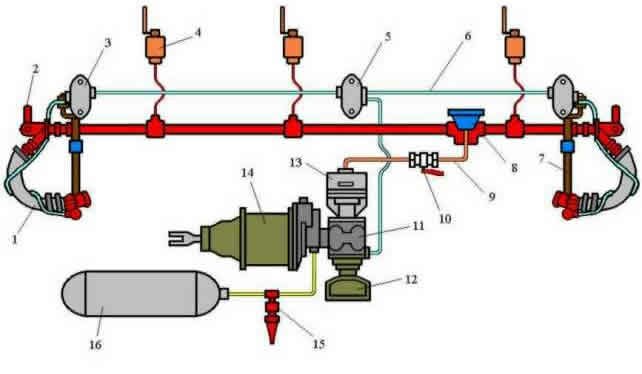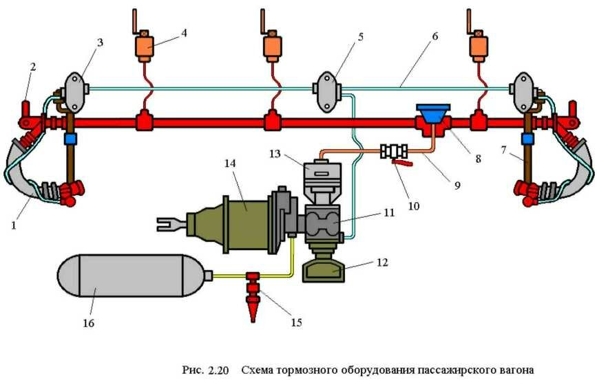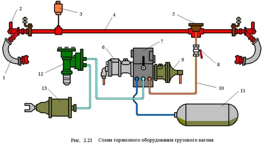 В каждом пассажирском вагоне имеется не менее трех стоп-кранов 4, два из которых расположены в тамбурах вагонов. Запасный резервуар (ЗР) 16 объемом 78 л соединен трубой диаметром 1" (25,4 мм) с кронштейном задней крышки тормозного цилиндра 14. На трубе от запасного резервуара к ТЦ установлен выпускной клапан 15 № 31. На некоторых типах пассажирских вагонов рабочая камера 11 с воздухораспределителями 12 и 13 установлены на отдельном кронштейне, а тормозной цилиндр 14 имеет обычную крышку. Грузовые вагоныДвухкамерный резервуар 7 прикреплен к раме вагона четырьмя болтами и соединен трубопроводом диаметром ?" (19 мм) с пылеловкой 5 через разобщительный кран 8 № 372. С запасным резервуаром (ЗР) 11 объемом 78 л и тормозным цилиндром (ТЦ) 13 диаметром 14" (356 мм) двухкамерный резервуар соединен через автоматический регулятор режимов торможения (авторежим) 12 № 265А. К двухкамерному резервуару 7 прикреплены магистральная 9 и главная 6 части воздухораспределителя № 433.