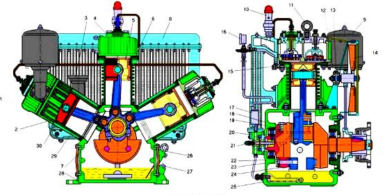 Компрессор КТ-6 состоит из корпуса (картера)13, двух цилиндров 29 низкого давления (ЦНД), имеющих угол развала 120°. одного цилиндра 6 высокого давления (ЦВД) и холодильника 8 радиаторного типа с предохранительным клапаном 10, узла шатунов 7 и поршней 2, 5.