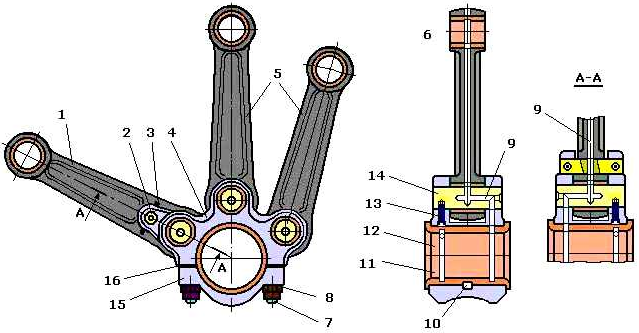 Узел шатунов состоит из главного 1 и двух прицепных 5 шатунов, соединенных пальцами 14, застопоренными винтами 13. 1- главный шатун, 2, 14 -пальцы, 3, 10 - штифты, 4- головка, 5- прицепные шатуны, 6- бронзовая втулка, 7- шпилька, 8- замковая шайба, 9- каналы для подачи смазки, 11, 12-вкладыши, 13- стопорный винт, 15- съемная крышка, 16- прокладка