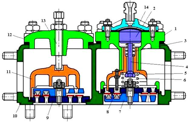 Во всасывающей полости расположен всасывающий клапан 8 и разгрузочное устройство, необходимое для переключения компрессора в режим холостого хода при вращающемся коленчатом вале. Разгрузочное устройство включает в себя упор 9 с тремя пальцами, стержень 11, поршень 13 с резиновой диафрагмой 14 и две пружины 10 и 12.