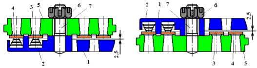 Всасывающие и нагнетательные клапаны состоят из седла 1, обоймы (упора) 5, большой клапанной пластины 2, малой клапанной пластины 3, конических ленточных пружин 4, шпильки 7 и корончатой гайки 6. Седла 1 по окружности имеют по два ряда окон для прохода воздуха. Нормальный ход клапанных пластин 1,5 – 2,7 мм.