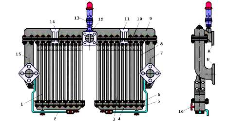 Воздух, нагретый при сжатии в ЦНД, поступает через нагнетательные клапаны в патрубки 7 и 15 холодильника, а оттуда - в крайние отсеки верхнего коллектора 9. Воздух из крайних отсеков по 12 трубкам каждой радиаторной секции поступает в нижние коллекторы, откуда по 10 трубкам каждой секции перетекает в средний отсек верхнего коллектора, из которого через всасывающий клапан проходит в ЦВД. Проходя по трубкам, воздух охлаждается, отдавая свое тепло через стенки трубок наружному воздуху.