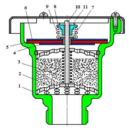 Сапун состоит из корпуса 1 и двух решеток 2, между которыми установлена распорная пружина 3 и помещена набивка из конского волоса или капроновых нитей. Над верхней решеткой помещена фетровая прокладка 4 с шайбами 5, 6 и втулкой 7. На шпильке 10 шплинтом 11 закреплена упорная шайба 8 пружины 9. При повышении давления в картере компрессора, например, за счет пропуска воздуха компрессионными кольцами, воздух проходит через слой набивки сапуна и перемещает вверх фетровую прокладку 4 с шайбами 5 и 6 и втулкой 7. Пружина 9 при этом оказывается сжатой. Сжатый воздух из картера компрессора выходит в атмосферу.