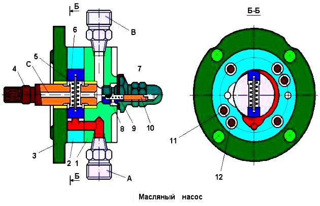 Масляный насос приводится в действие от коленчатого вала, в торце которого выштамповано квадратное отверстие для запрессовки втулки и установки в нее хвостовика валика 4. Масляный насос состоит из крышки 1, корпуса 2 и фланца 3, которые соединены между собой четырьмя шпильками 12 и центрируются двумя штифтами 11. Валик 4 имеет диск с двумя пазами, в которые вставлены две лопасти 6 с пружиной 5. Благодаря небольшому эксцентриситету, между корпусом насоса и диском валика образуется серповидная полость.