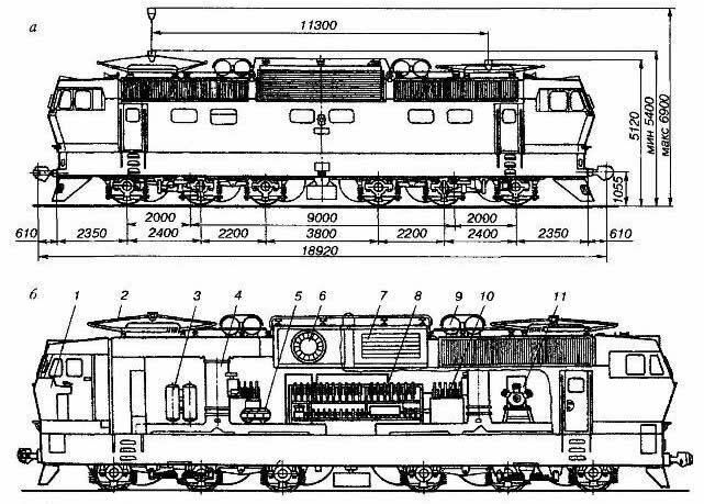Базовый тип электровоза а - основные конструктивные размеры, б - радаещение оборудования 1 -кабина управления, 2 - токоприемник, 3 - воздушные резервуары, 4 - воздуховоды системы вентиляции тяговых двигателей, 5 - электропневматическое тормозное оборудование, 6 - мотор-вентилятор, 7 - жалюзи с фильтрами, 8 -групповой электрический переключатель (силовой контроллер), 9 — главные воздушные резервуары, 10 — реверсоры и тормозные переключатели, 11 - мотор-компрессор