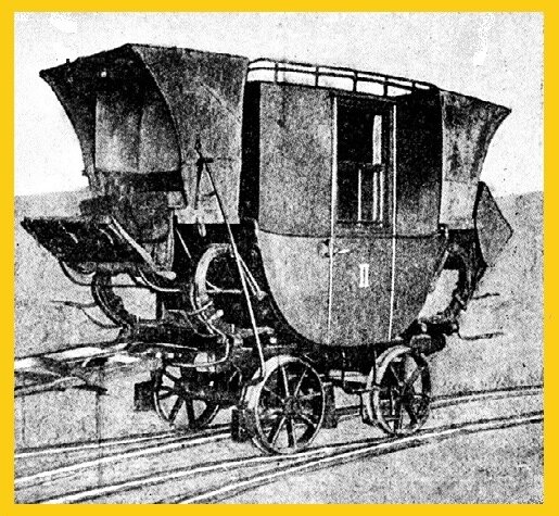 На рисунке показан один из первых пассажирских вагонов. Собственно говоря – это и не вагон вовсе, а обычная карета, поставленная на железные колеса с ребордами, позволяющими катиться по рельсовому пути. Довольно хорошо видны у передних колес тормозные колодки и длинный, идущий наверх рычаг, посредством которого эти колодки прижимались к поверхности катания колес. Рукоятка управления находится по левую руку кучера. Стоп – стоп! Какого кучера? Ведь это вагон пассажирского поезда! Тем не менее, на сиденье близ тормозного рычага постоянно находился человек и по звуковому сигналу машиниста паровоза затормаживал свой вагон. Этот человек назывался «кондуктор», что в переводе с английского означает «сопровождающий».