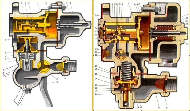На железных дорогах России тройной клапан Вестингауза применялся почти сто лет, до 1959 года. Вот рисунок, изображающий одну из последних его модификаций – условный номер 219 (слева).