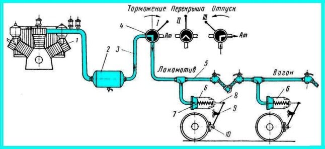 Кран (пробка) может иметь три положения. В положении I канал в пробке соединяет питательную магистраль 3 с тормозной магистралью 5, в которую поступает сжатый воздух и проходит по всем вагонам до хвоста поезда. На каждом вагоне имеется ответвление от тормозной магистрали, ведущее к тормозному цилиндру 6. Воздух воздействует на поршень тормозного цилиндра 7; поршень смещается вправо (по рисунку), выдвигая шток 8. Конец штока 8 посредством рычага 9 связан с тормозной колодкой 10. Таким образом, в положении I происходит торможение поезда.