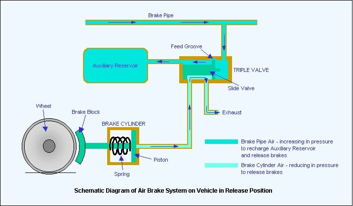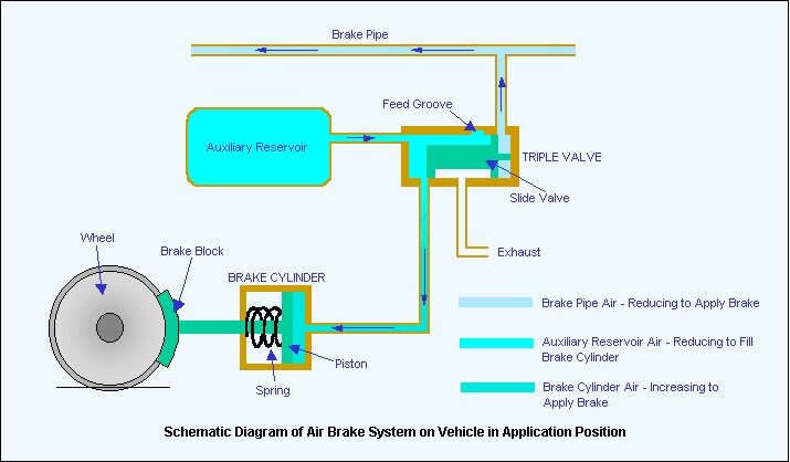 Нижняя часть отсекает выход из тормозного цилиндра в атмосферу, зато становится таким образом, что позволяет воздуху перетечь из запасного резервуара в тормозной цилиндр. Воздух поступает в тормозной цилиндр, действует на поршень (Piston), выходит шток и тормозная колодка (Brake Block) прижимается к колесу (Wheel). Происходит торможение.