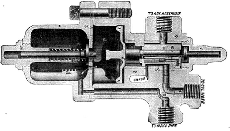 Тройной клапан Вестингауза в конце XIX века выглядел вот так (картинка взята из тогдашней английской инструкции по тормозам).