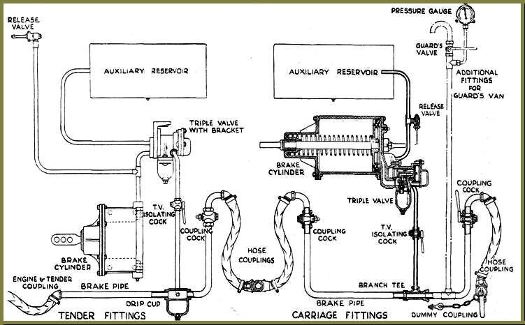 Разумеется, это понимал Джордж Вестингауз; в придуманной им схеме на каждом вагоне устанавливались тройной клапан и запасной резервуар. Картинки, поясняющие идею Вестингауза, взяты из английского источника; отдавая дань уважения изобретателю, мы запомним английские названия основных тормозных приборов.